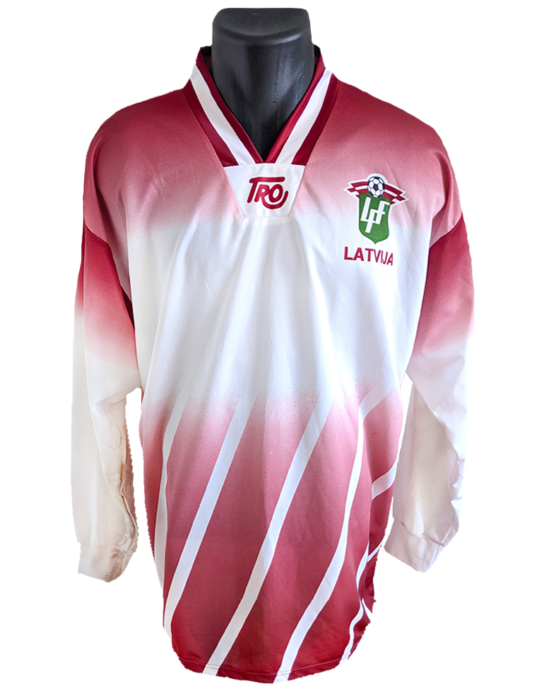 This particular shirt was worn by Latvia’s captain Jurijs Ševļakovs in a game against Scotland in October 1997. After the game, the shirt was traded with Scottish player Darren Jackson who later sold it to Classicfootballshirts who then sold it to me, along with a certificate of authenticity, signed by Jackson.